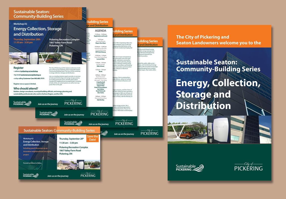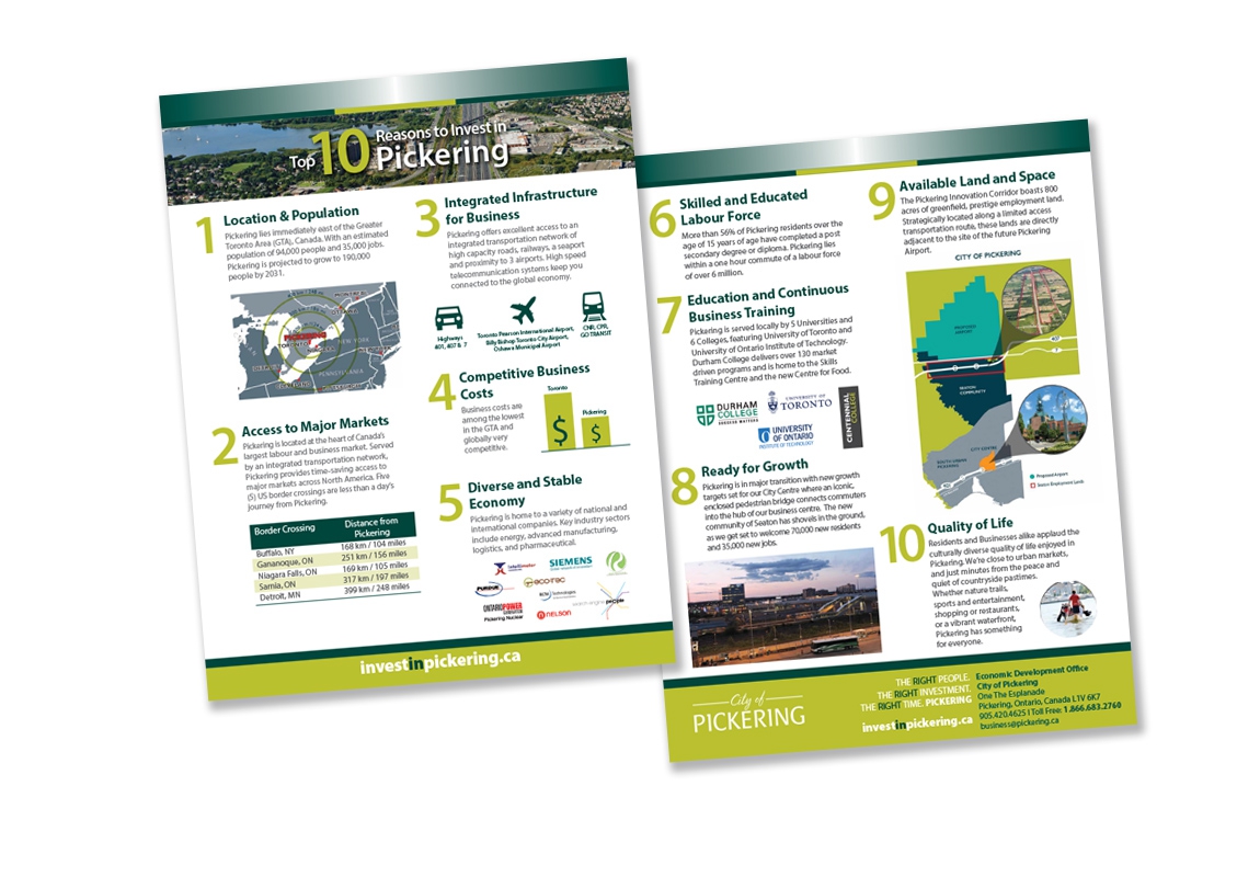 The City of Pickering is strategically located as the eastern gateway to the Greater Toronto Area. Facing the challenges of a growing city, TD Graham + Associates was engaged to develop a series of brand initiatives, including a brand alignment guide, plus marketing materials for their City Centre, newsletters and Economic Development collateral.