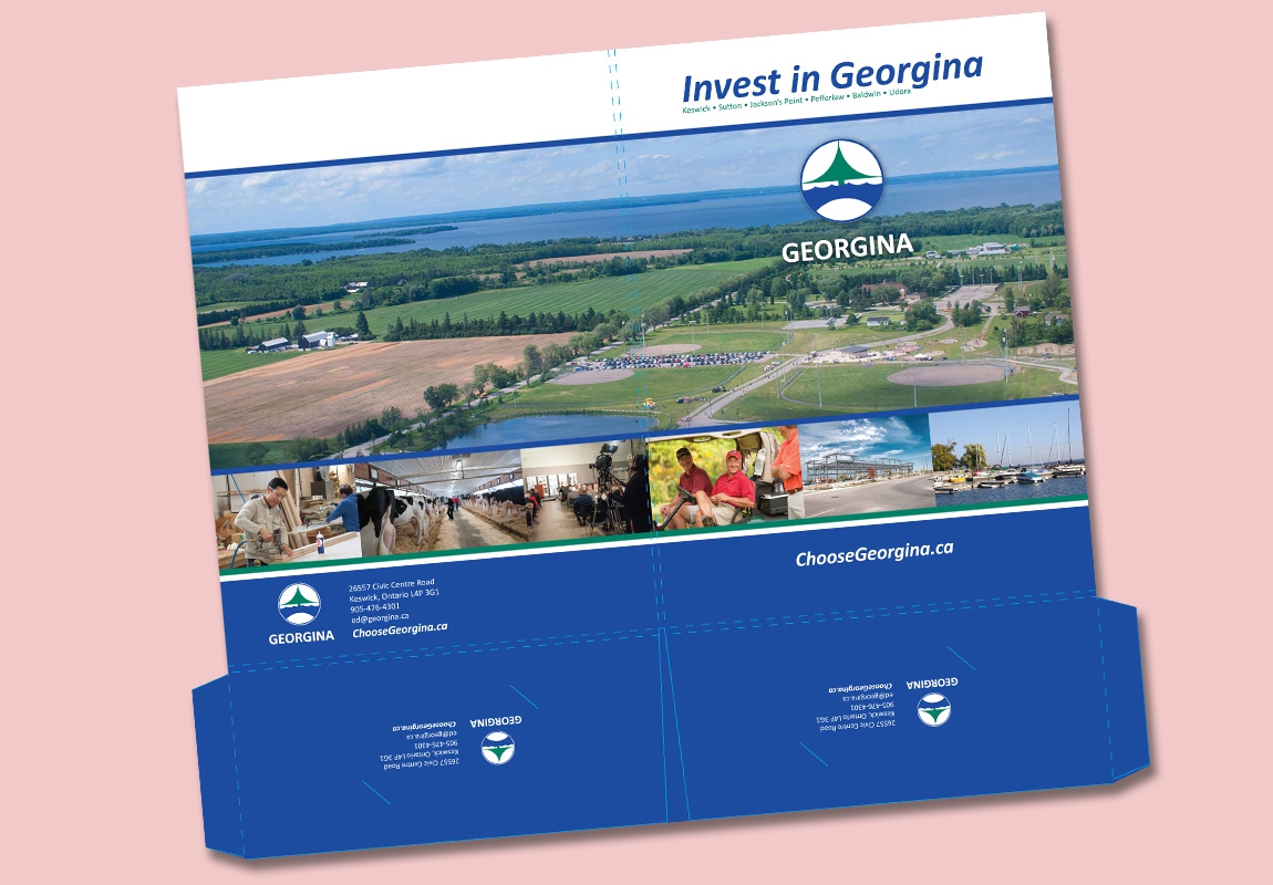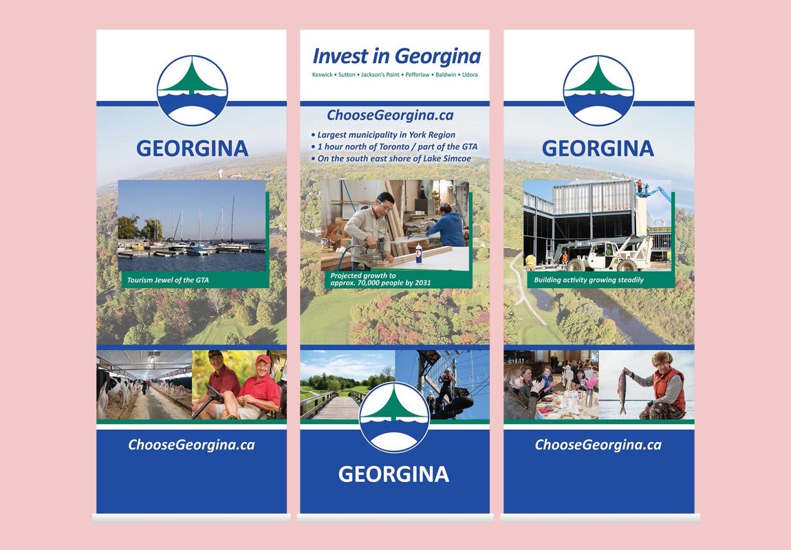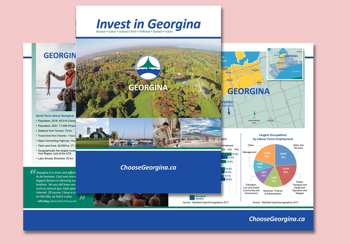 Located north of Toronto the Town of Georgina engaged TD Graham, in partnership with McSweeney & Associates, to develop an Investment Attraction Strategy for the Town’s Economic Development Department. As part of the project, we designed several marketing tools to help them reach their target audiences. These included kit folder, displays, community brochure and video as well an overall refinement to their brand logo.