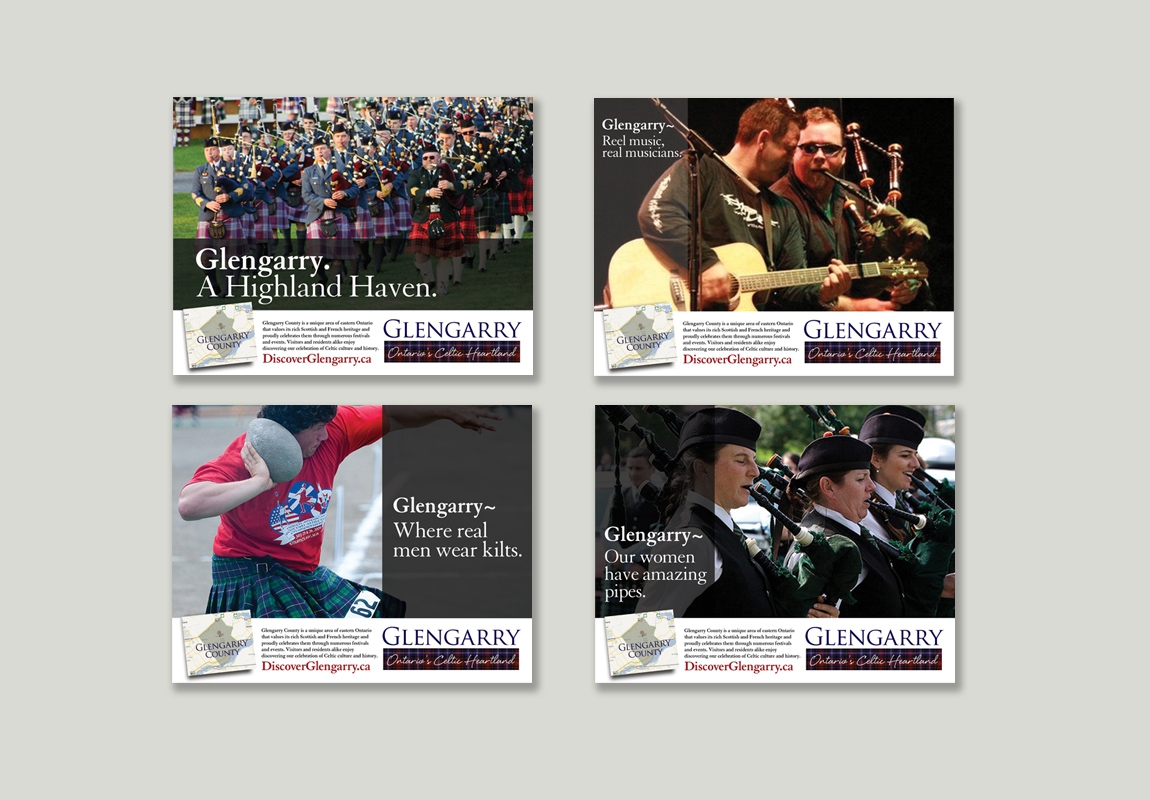 Glengarry County is a unique area in eastern Ontario that celebrates its rich Celtic heritage through numerous festivals & events. TD Graham + Associates was hired create a brand for the region that captured the essence of its assets and traditions. We developed the tagline "Ontario's Celtic Heartland" and designed a brand that included the Glengarry tartan – recreated pixel by pixel from the actual Scottish plaid commissioned by the Glengarry Highland Games Association.